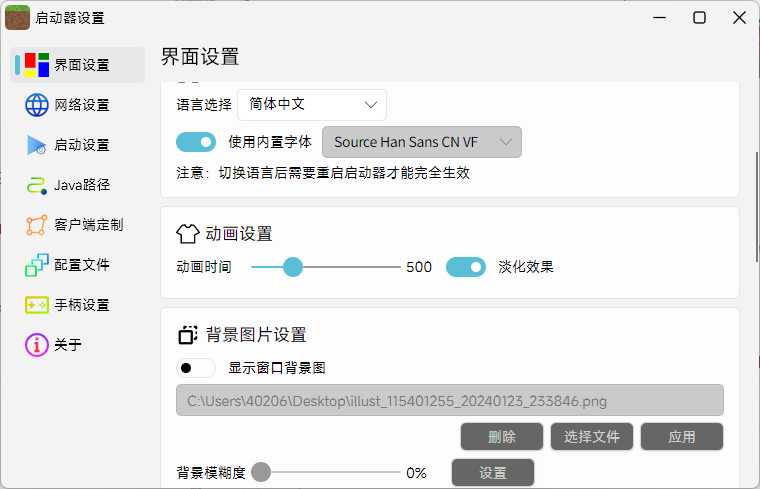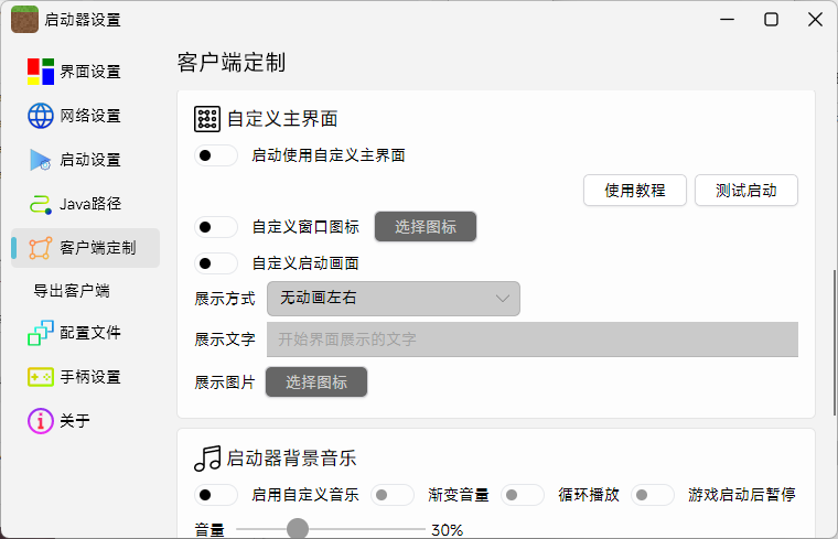 - 背景音乐 在启动器启动时循环播放音乐,支持网络音乐链接