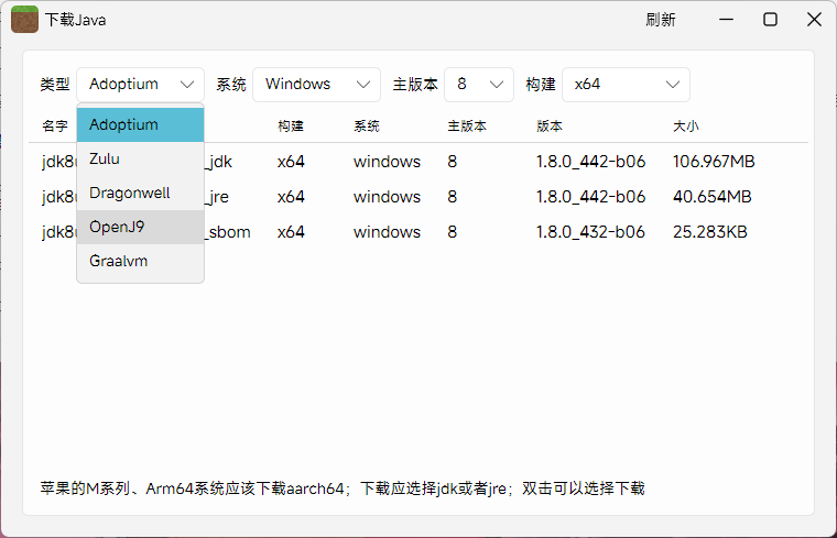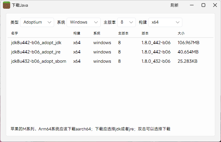 双击文件即可下载并自动安装,下载会下载到启动器的JAVA列表