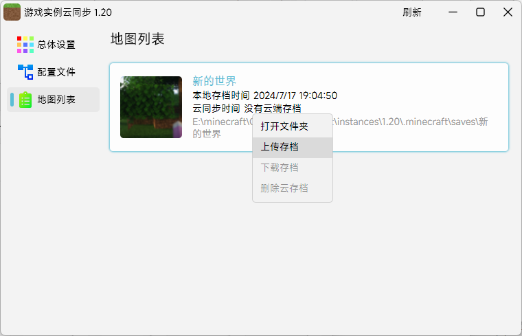只能选择上传了配置的游戏实例,若为已经在本地的游戏实例不会在此列表中展示